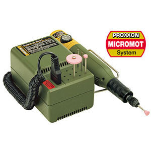 MICROMOT mains adapter NG 2/E. Very compact design. NORYL casing (heat resistant - a necessity for transformer enclosures). Red LED indicates readiness for use. PTC (Positive-Temperature-Coefficient) element prevents overload (and plugged-in tool will not restart automatically). Practical design with holes for storing bits. Foldable tool rest provides a secure place for keeping the MICROMOT tool on standby. Thyristor electronic speed control (with feedback) for adjusting bit speed to suit the job, as well as providing high torque at low speeds.
