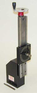 The attachment consists of a steel dovetailed vertical column with a solid aluminum base that attaches to the bed of the lathe in place of the headstock. The headstock then mounts to a dovetailed saddle on the vertical column. The saddle is raised and lowered to control the depth of cut by turning a handwheel. Calibrations on the handwheel enable depth control to .001" (.01mm on metric machines). Parts to be machined are mounted on the crosslide. This deluxe version replaces the standard handwheel with a 2-1/2" adjustable "zero" handwheel.